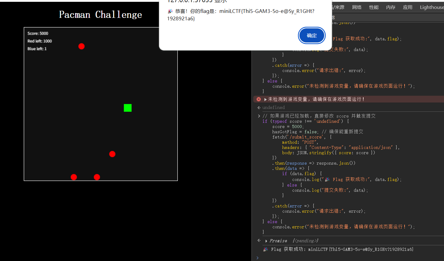 最后再做出一次正确的数字,触发获得flag的逻辑。