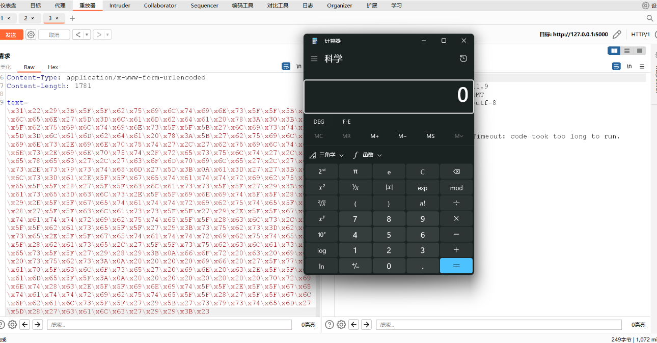 所以我们借鉴一下sql注入的思想,构造text=");<python code>;#就能够执行中间的代码,并且可以通过Unicode编码来实现输入换行符,缩进等等,来执行多行代码。