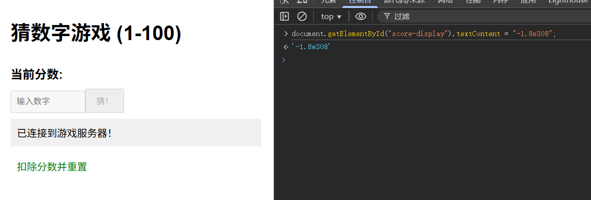 在输入错误第99次后,在控制台输入以下代码,把分数调整为-1.8e308。