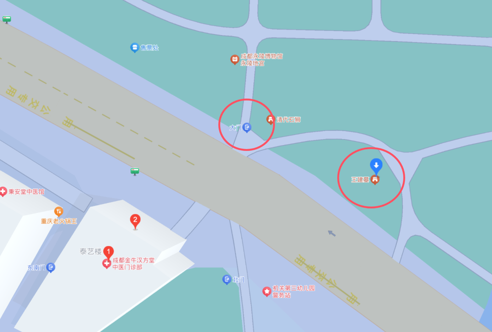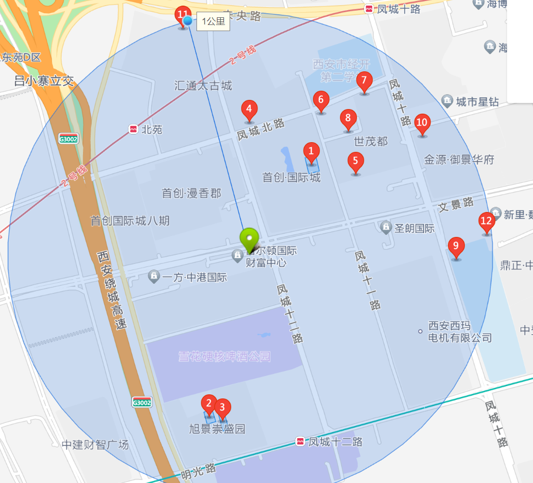 通过地图搜索,得知在西安雄峰集团仅此一家,则以此为中心,画圈寻找幼儿园。